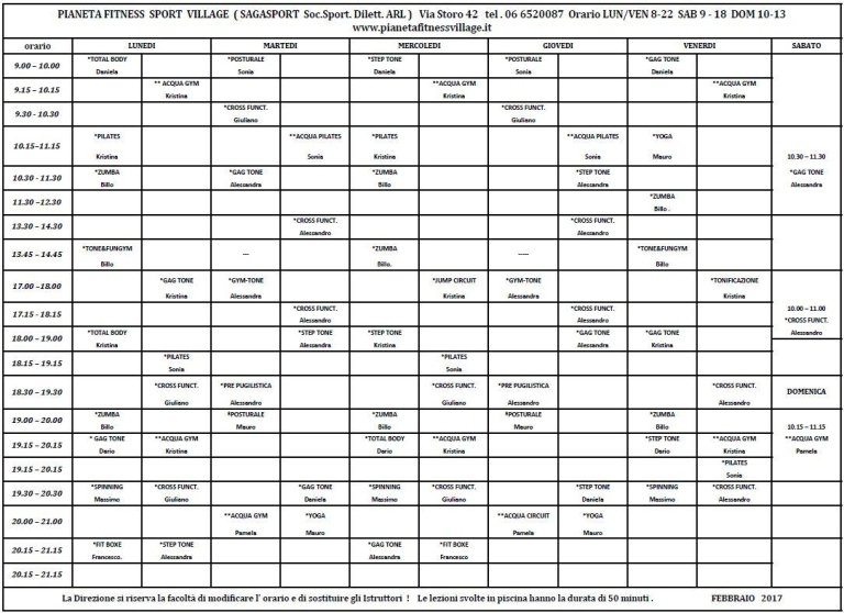 In una location piacevole e tranquilla del litorale laziale a Fiumicino, immersa nel verde e a due passi dal mare, il nuovo Village Sportivo di Pianeta Fitness consentir a tutti (dai bimbi pi piccoli alla terza et) di concretizzare la propria voglia di movimento, divertimento e relax e soprattutto di sentirsi in forma. Orari Pianeta Sport Centro fitness e Piscina Alessandria Tutti gli orari del nostro centro fitness. Pianeta Fitness quello che fa al caso tuo. Troverai anche gli orari di accesso a tutte le aree di attivit come la sala pesi, la piscina ed il centro benessere.